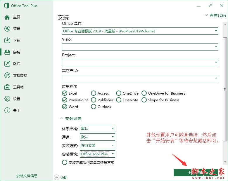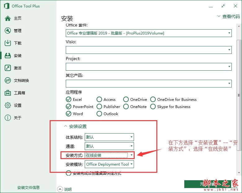 3、安装流程 - 安装设置 - 安装模块:Office Tool Plus(此选项至关重要,务必选对,否则将无法进行安装)
