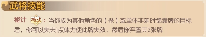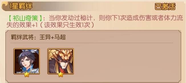 1星【祁山奇策】:当你发动过秘计,则你下1次造成伤害或者体力流失的效果+1(该效果只生效1次);