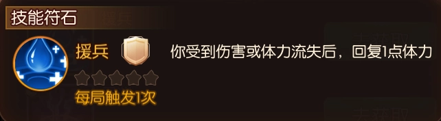 【援兵】:王异发动技能需失去1点体力,而当王异因发动技能失去体力时,【援兵】能立刻帮其补充这失去的体力。可以这么讲,【援兵】堪称王异的绝配符石,它直接让王异的强度提升了一个层级。