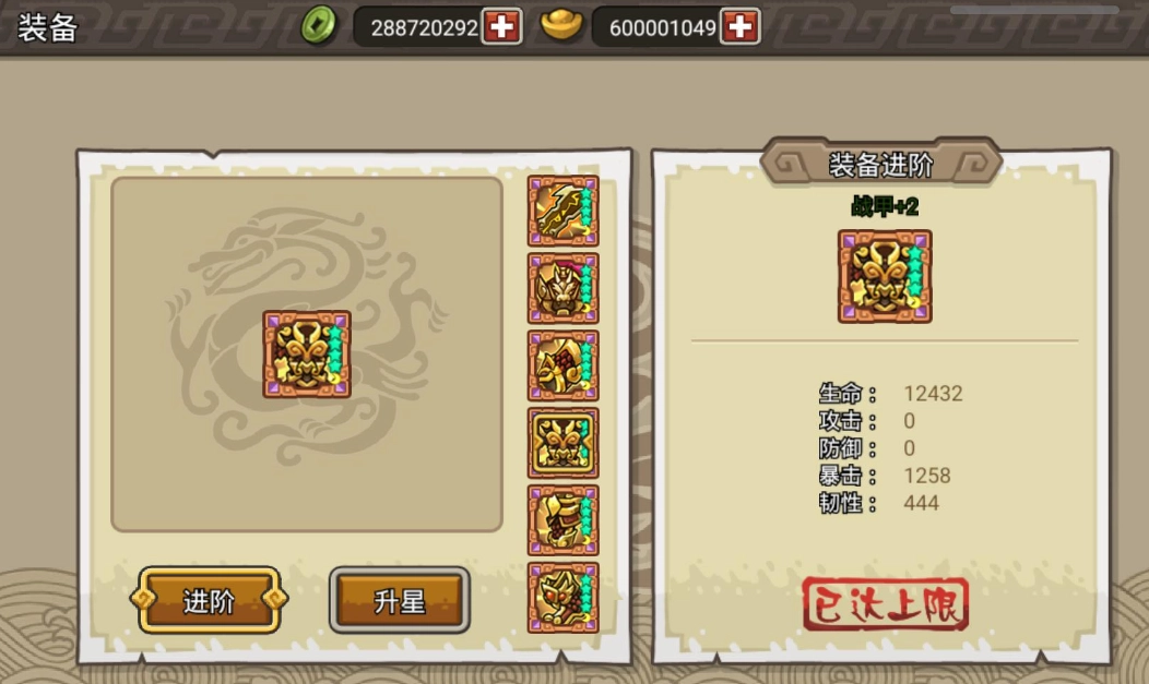 满级装备属性下的升星顺序为:武器>战甲>头盔>护手>鞋子>腿甲 。不过这只是个人建议,考虑到以攻击为主,也能把鞋子放在护手之前。优先对攻击属性进行升星,毕竟在当前的野怪面前,防御属性形同虚设,基本都是被野怪一刀秒。