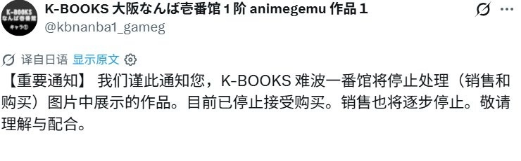日本二手周边连锁店K-BOOKS于近日发布公告,宣布将停止销售及收购多部热门作品的相关商品。此公告由K-BOOKS大阪难波分店的官方社交媒体账号发出,其中列出了十三部动画游戏作品,这些作品的周边商品将不再在该店进行销售。