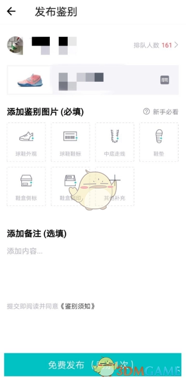 6、最后一步是添加鉴别图片,要留意各个位置的图片都应尽可能清晰,同时,像一些购买鞋子的相关信息,也可以进行备注。完成这些操作后,点击“免费发布”,接着就只需等待鉴定师反馈信息了。