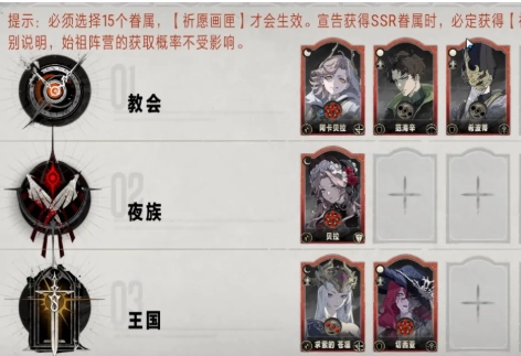 玩家在做选择时,可参考各阵营推荐的角色。教会阵营推荐阿卡拉贝,若选择王国阵营,则可选择切西尔。此外,玩家需留意,要是抽到归乡的哈提,也有多种选择,比如可以选择阿加雷斯。