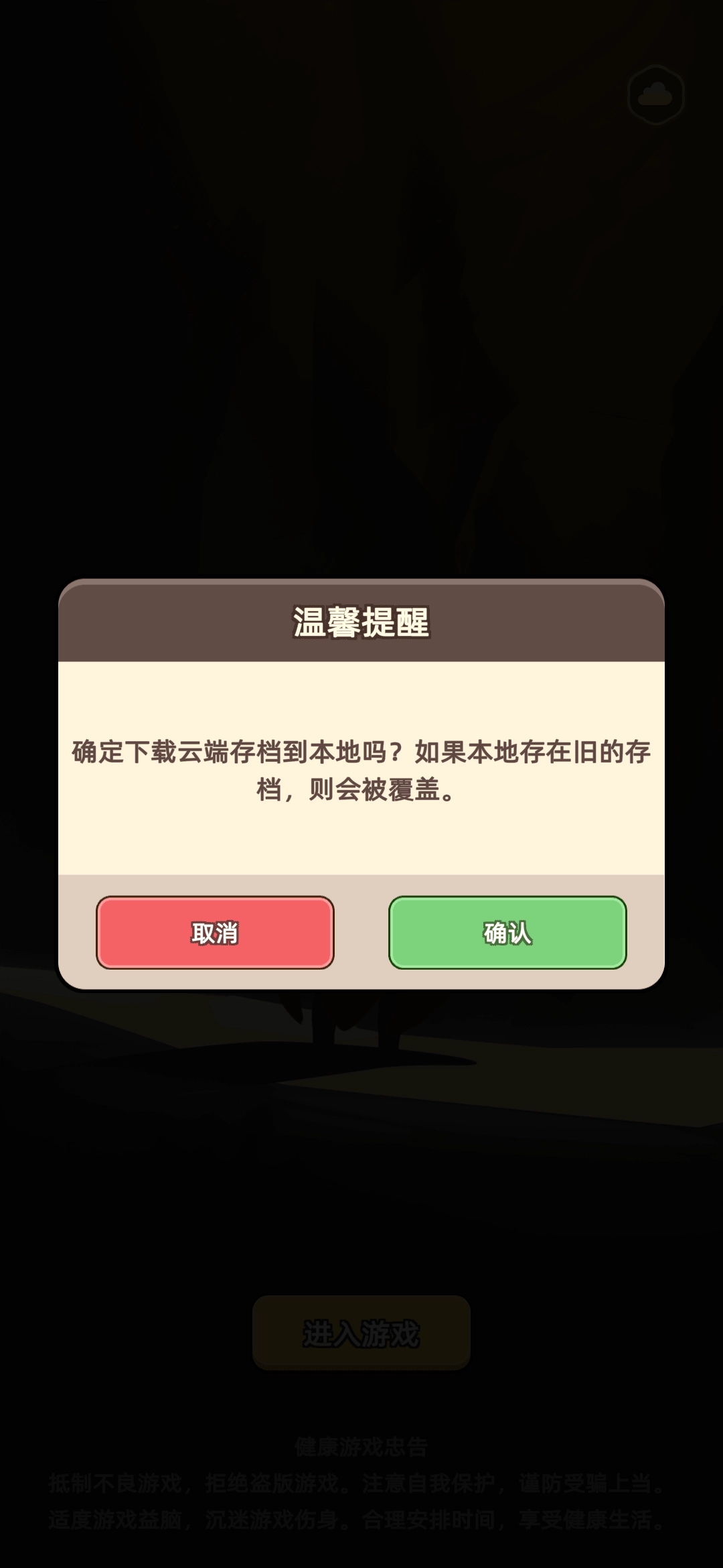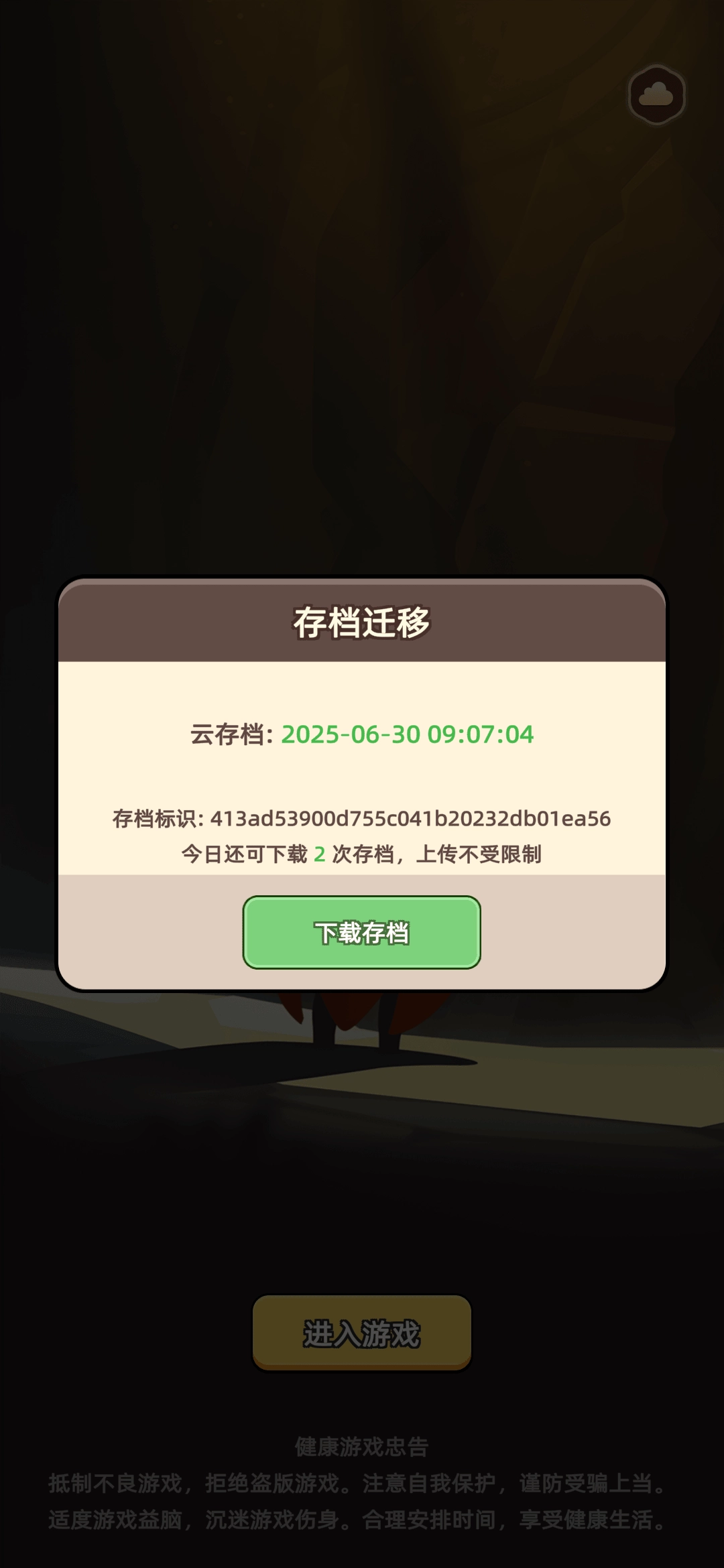 在游戏启动界面,点击右上角的【云朵图标】,即可进入存档迁移页面。进入该页面后,您只会看到【下载存档】按钮,在此处能够下载云存档,并将其作为本地存档使用。