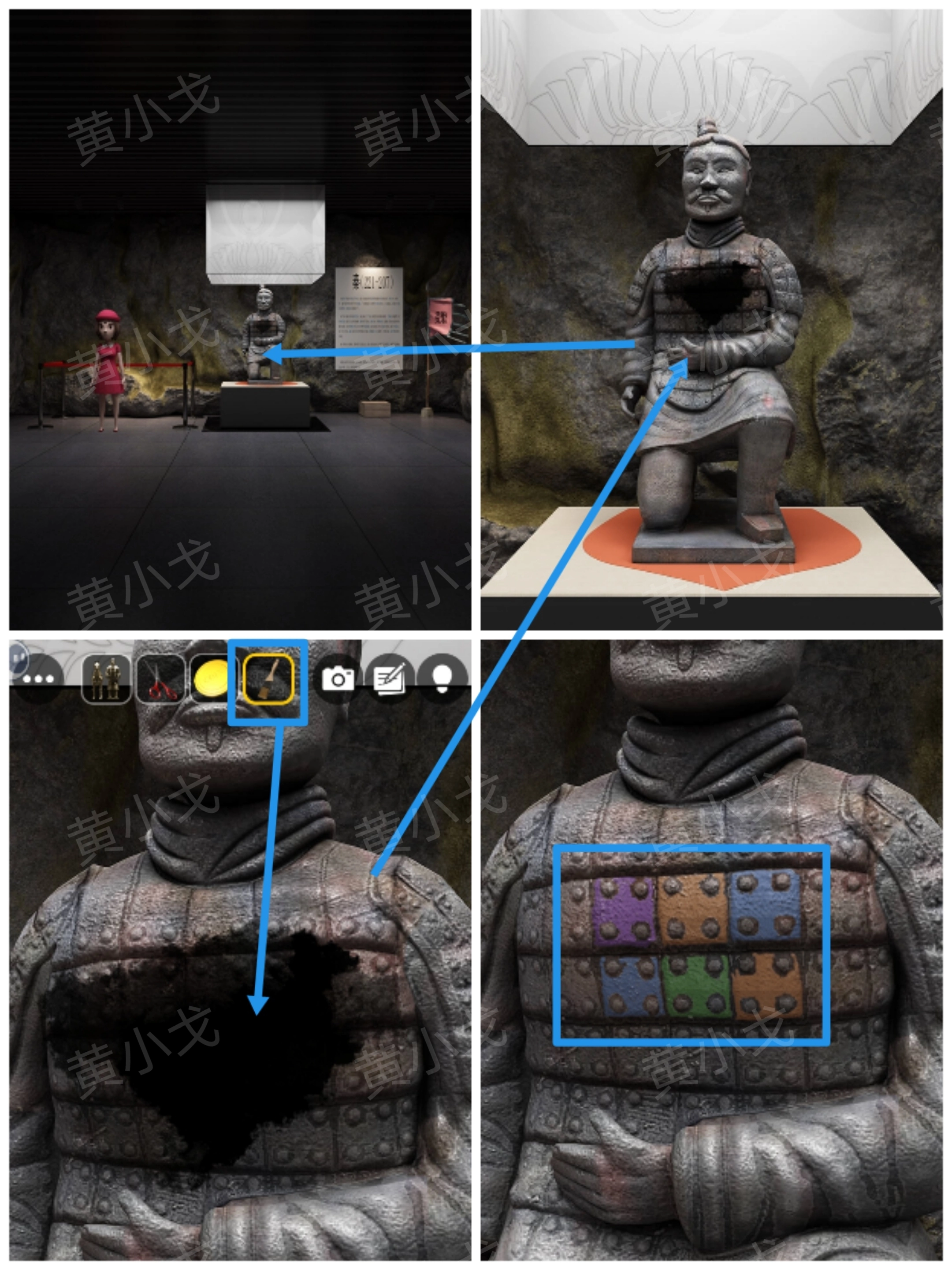 9. 轻点兵马俑胸口的污渍,拿起【刷子】将其刷拭干净,进而获取线索。