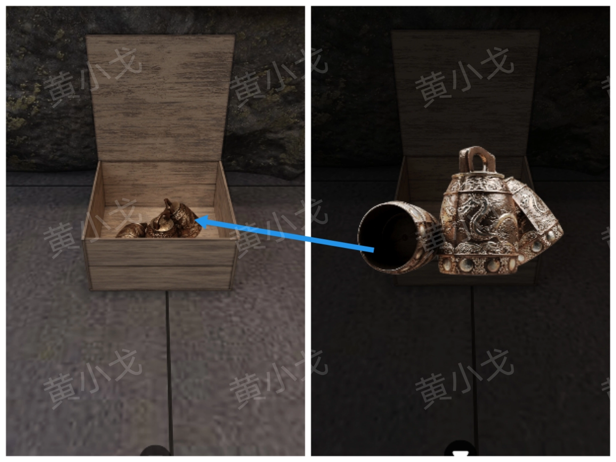 7. 轻点地上的箱子,依据[展览区]场景中盘子上呈现的图案线索,对密码锁进行调整。