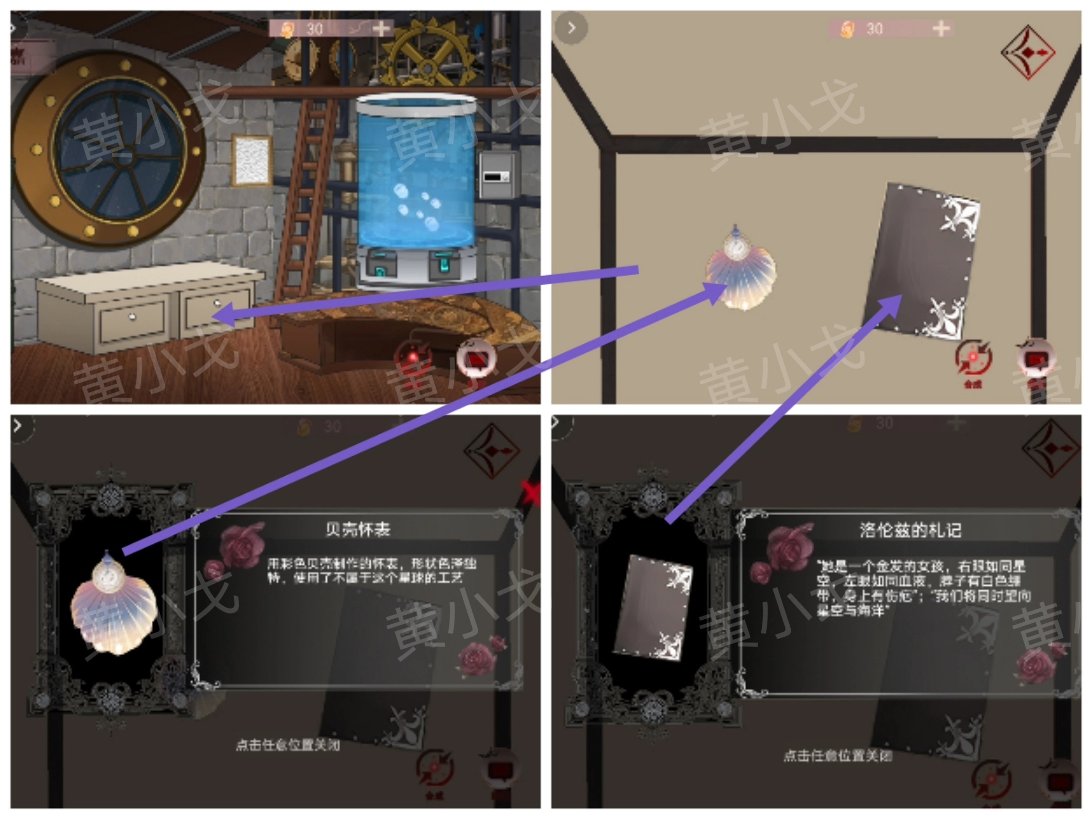 1. 轻点白色柜子,拉开抽屉,获取【贝壳怀表】与【洛伦兹的札记】