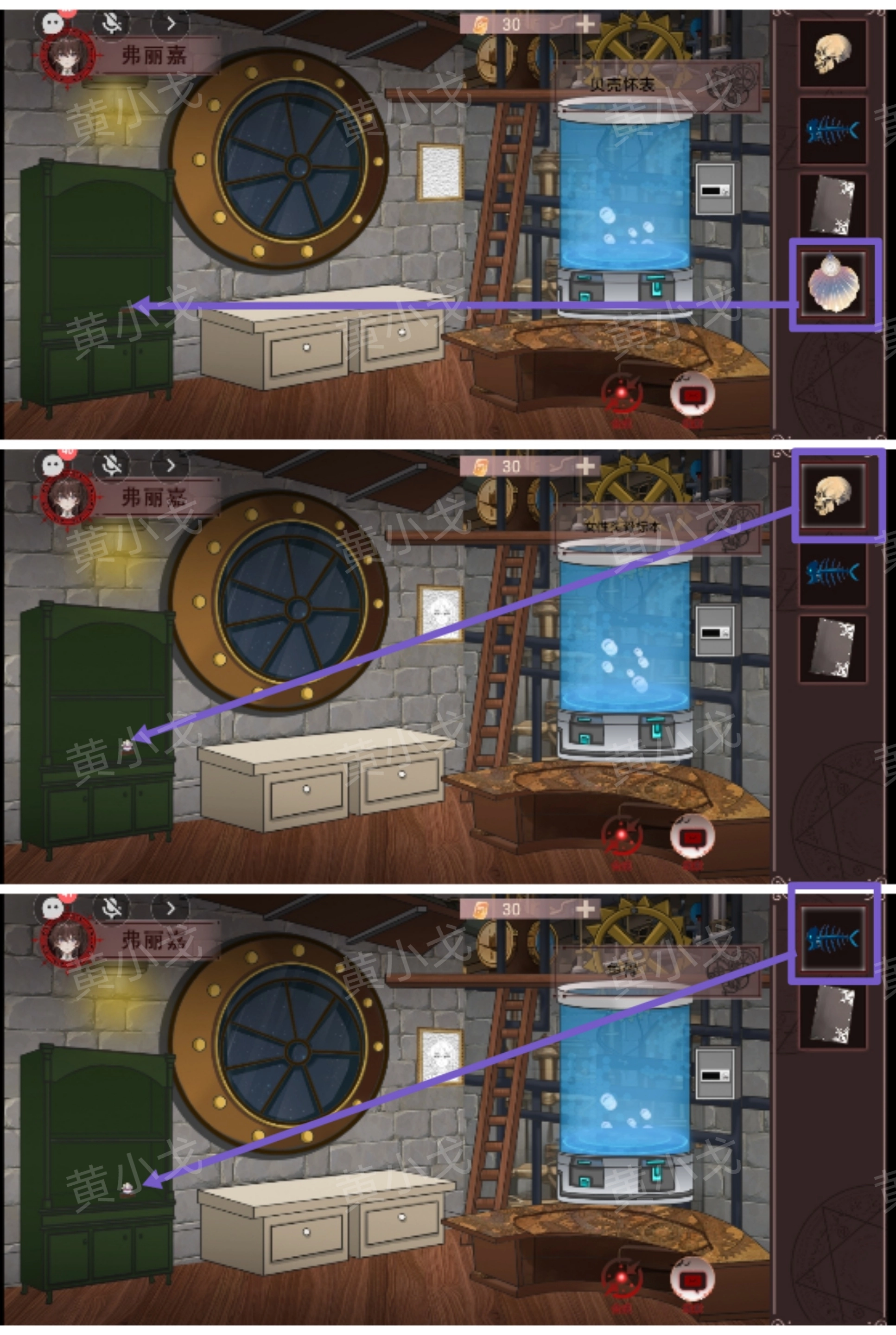 3. 将【贝壳怀表】放置在柜子上的底座之上;利用贝壳怀表把【鱼骨】以及【女性头骨标本】传递给队友