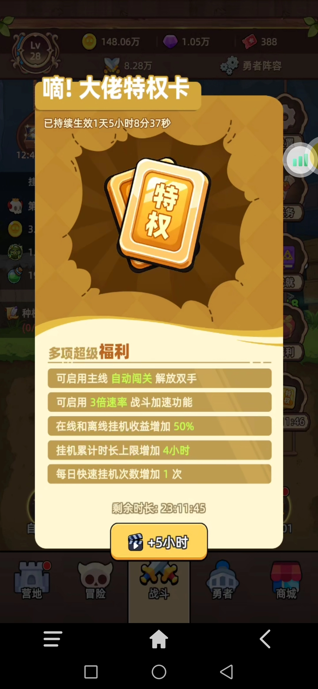 推图加速:开局,特权卡广告拉满,直接3倍速度加自动推关