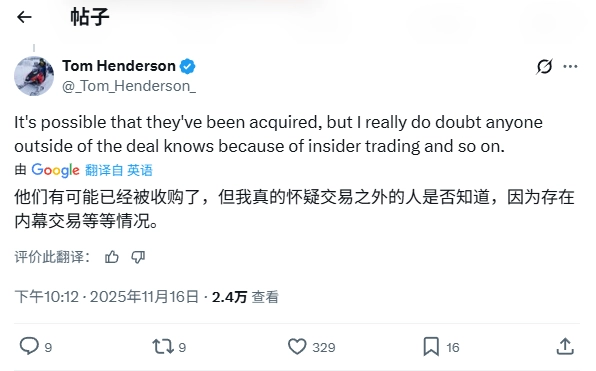 知名爆料人Tom Henderson在评论区也回应称:“或许他们已被收购,但我确实怀疑,除了交易相关人员外,是否有人知晓此事,毕竟这可能涉及内部交易等因素。”