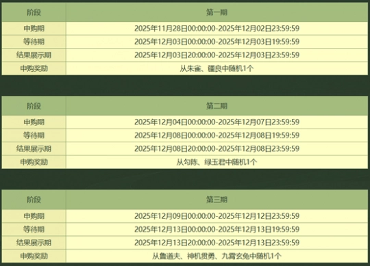 灵宠献瑞活动总共分为三期,按第一期到第三期的顺序依次开启。每期活动都包含三个阶段,顺序分别是申购期、等待期和结果展示期。在活动申购的有效时间里,玩家能够通过福利中心的【灵宠献瑞】界面查看本期的奖励,并且可以点击【申购】按钮来申购本期的灵宠。完成申购后,玩家会立刻得到与申购时支付的金元宝等额的银元宝,还能额外获赠20%的银元宝。等待期结束当天的20:00,系统会从所有成功参与该活动的玩家中,随机抽取一位玩家来获得当期的奖励。
