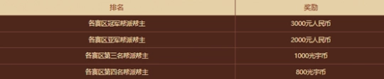 玩家也能参加“109”新服的首届帮战,除了游戏内的奖励之外,还能额外拿到“群雄逐鹿”活动的奖励。在“109”新服首届帮战里,任意赛区获得第一、二名帮派的帮主可以得到现金奖励,第三、四名帮派的帮主则能获得光宇币奖励。各个赛区冠军帮派的成员(参与过帮战战斗,并且在奖励发放时仍然留在冠军帮派的成员)可获得限时60天的铭牌“中洲强者”。