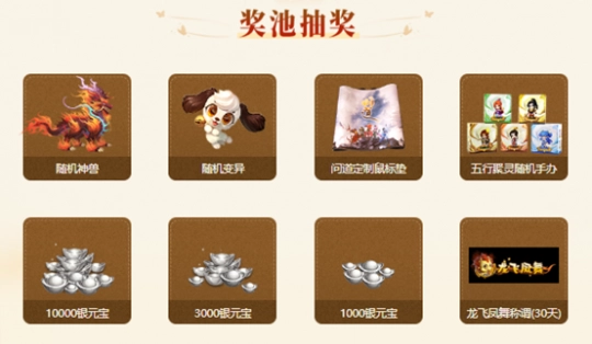 参与试道大会且与其他玩家对战时至少获胜一场,或者参与过帮战战斗的玩家,可前往“逐鹿争锋”页面的奖池进行抽奖。奖池内设有随机神兽、变异宠物、银元宝、问道周边产品,以及限时30天的“龙飞凤舞”称谓等奖励。