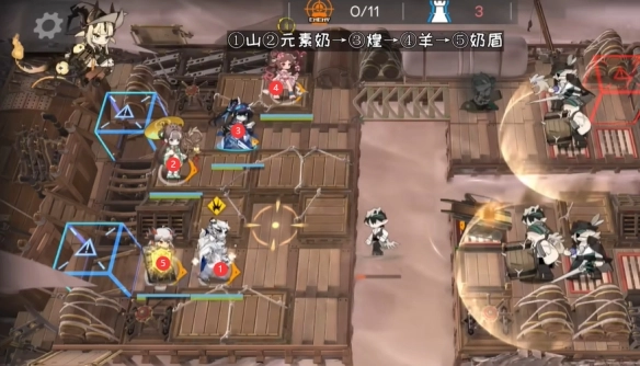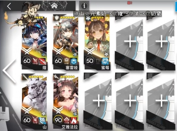 所需干员:煌(负责地面输出)、山(地面输出)、塞雷娅(定位重装)、艾雅法拉(高台输出)、蜜莓(元素奶)