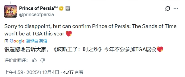 “很抱歉让大家失望,但我们可以确认《波斯王子:时之砂》今年不会出现在TGA上,”官方在帖子中写道。此次直接辟谣,终结了此前业内的多方推测。包括Insider Gaming在内的消息源曾猜测,这款定于2026年1月发售的游戏可能会选择TGA作为发售前的重要展示窗口。