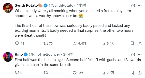 知名游戏博主Synth Potato和Rino在评论区留言道:“真搞不懂你们怎么想的,居然会把一款免费的英雄射击游戏当作压轴项目?典礼最后一小时的节奏彻底乱了,全程没有任何让人激动的高光时刻,太需要一个真正的终极惊喜了。不过前面两个小时还挺棒的!”