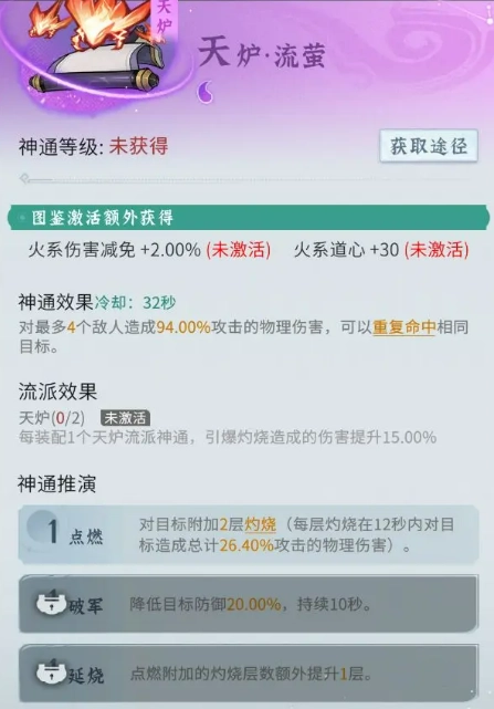 天炉流派的战术侧重于借助“灼烧引爆”的形式,实现强烈的物理伤害爆发。不同于离火流派的持续压制战术,天炉流派的特色在于其频繁且覆盖范围广阔区域的爆炸性清除能力。当玩家装备天炉系列的神通后,每多装备一个此类神通,燃烧引爆的伤害便会提升15%,这显著增强了输出效率。在核心神通的挑选方面,天炉·陨火必不可少,它作为天炉流派的核心技能,可召唤火流星自天而降,瞬间点燃并引爆目标区域,成为迅速清理战场的极佳方式。