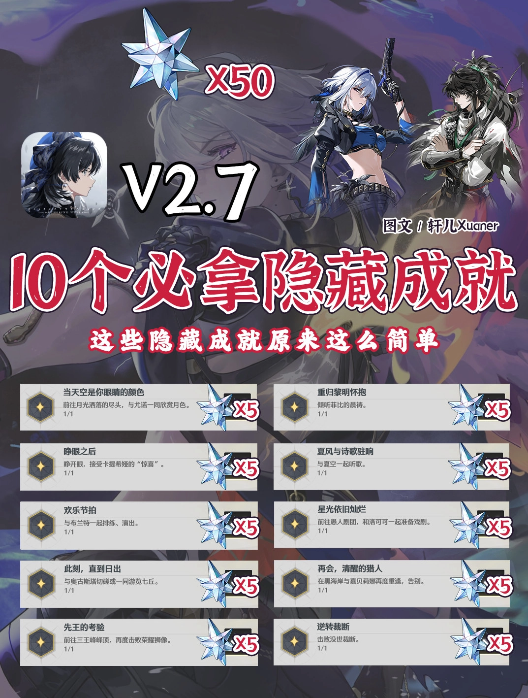 2.7版本上半部分总计有10个隐藏成就,其中8个是通过与黎那汐塔的角色进行对话解锁的,另外2个则需要击败强大的BOSS才能达成。