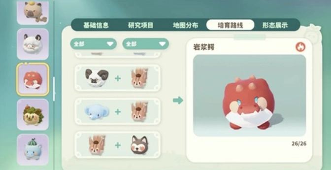 获取栗子鼠之后,接下来要让它和蓬蓬哈、大耳象或者卷卷绵进行约会融合,融合成功就能得到岩浆鳄的蛋。作为中间形态的岩浆鳄,也会对最终形态燃尾虎的词条品质产生影响。所以建议在前面几代培养时就留意速度、亲密度这些关键的词条,这样后续的培养才能更有效率。