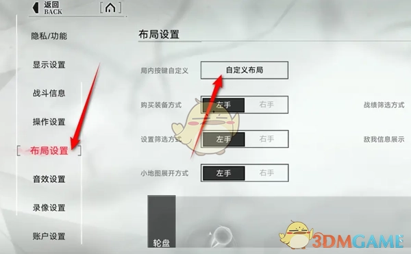 2、随后在设置菜单栏里,点击布局设置,寻找到局内按键自定义并前往设置。