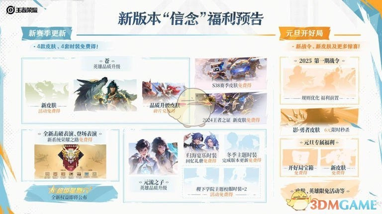 王者荣耀年度版本“信念”有哪些福利?明日,王者荣耀将迎来更新,玩家下载更新后便会进入全新的“信念”版本。想必不少玩家都很好奇,更新后能领取到什么福利。不清楚的玩家不用着急,今天小编就为大家详细介绍王者荣耀年度版本“信念”的福利,感兴趣的玩家不妨接着和小编一起看看。