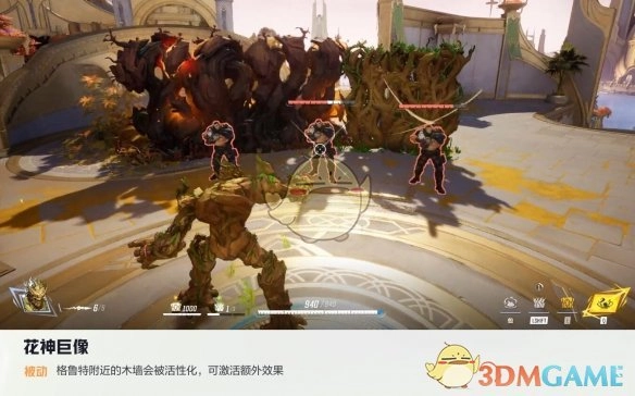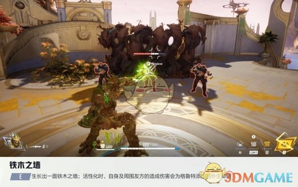 格鲁特能生长出一面铁木之墙,当这面墙活性化后,格鲁特自身以及周围友军所造成的伤害,都会为格鲁特增添额外生命值。