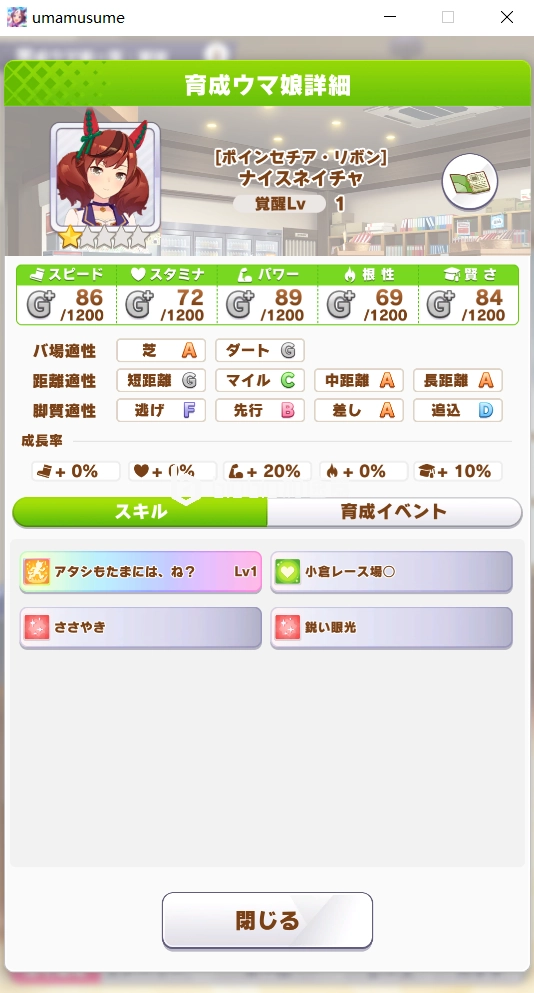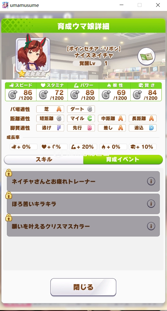 最后是优秀素质的两个互斥事件,触发条件为优秀素质参加皋月赏:若获胜,将单属性增加13、技能点提高53点并获得“跟干距离”技能;若未获胜,则属性与技能点的增益会下降,且无法获得该技能。
