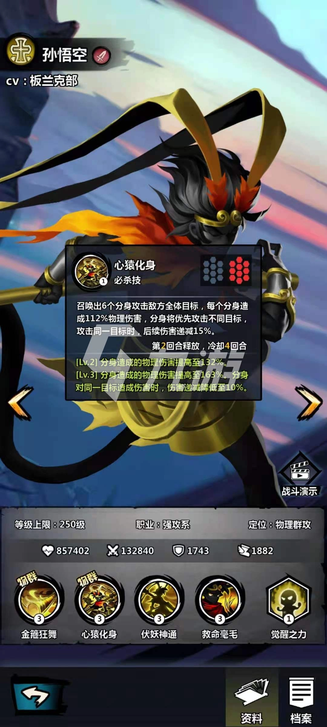 孙悟空的主动技能「金箍狂舞」会直接冲入敌方阵型,对一列敌人造成伤害并降低其物理防御。作为常规技能,它的表现还算不错——尽管列伤效果通常不及行伤,但面对特定阵型时也能发挥出亮眼作用。而他的必杀技「心猿化身」则是群体攻击技能:孙悟空会召唤分身攻击敌方全体,分身的伤害高低与他自身的攻击力紧密相关。