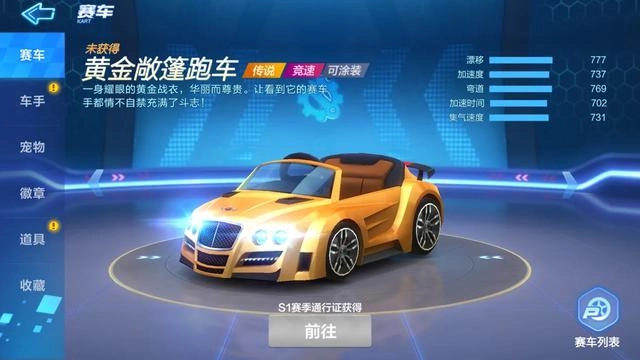 那辆土豪金的敞篷车,单看这一身金光闪闪的外观,就能感受到它的尊贵气质,既酷炫又不失文雅。性能数据更是相当出色,五项关键数据都达到了七百多分。不过实际使用它的玩家不算多,在高端对局里更是难得一见。