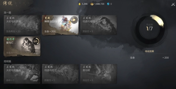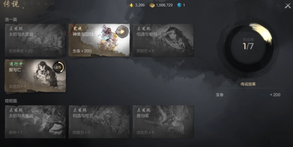传说剧情由多个记忆片段整合而成,整体分为两个篇章,每个篇章下包含共7个传说剧情,解锁这些剧情需要消耗记忆碎片。解锁后,玩家不仅能阅读对应的片段剧情,还可获得属性加成。记忆碎片是解锁传说剧情的关键道具,可通过探索地图获取;通常剧情顺序越靠后的,所需的记忆碎片数量也越多。
