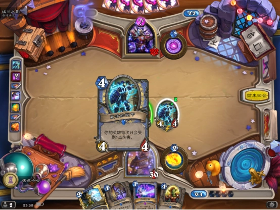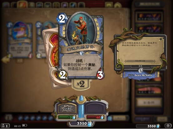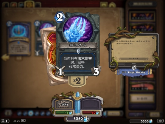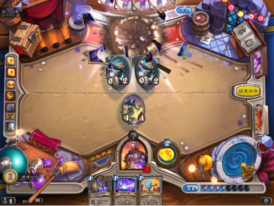 三、小编大概在8费的时候就成功击败了boss,核心思路就是只要有高伤害法术就直接往boss脸上招呼,但也别忽略了解场这一步;击败boss后我们能拿到两张新卡牌,分别是法师的麦迪文男仆和萨满的幽灵之爪。