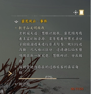 任务说明:玄机暗藏,可窥探天道奥秘;慧眼独具,能识别敌友。蛮荒之地富含矿脉资源,引得外界不法之徒常年偷偷潜入,从事非法活动。他们善于乔装改扮,寻常凡人难以分辨其真实身份。在此,特恳请各位仙长协助哨岗卫兵,深入调查,凭借诸位的慧眼明辨,分清敌我!