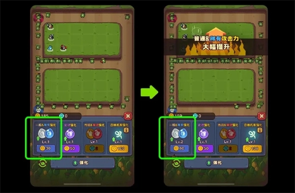 合理利用强化功能,强化按钮处于召唤按钮的下方。花费30金币,可把蓝白武将从Lv.1提升至Lv.2 ,此时白色武将攻击力提升100%,蓝色武将攻击力提升70%。