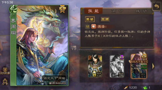 小编建议玩家在获得将魂后,不妨优先合成界周瑜这个武将。原因在于界周瑜不仅保留了标准周瑜的技能,还在此基础上得到了强化。具体来说,界周瑜的1技能既能提升他的手牌上限,还能让他额外多摸一张牌。
