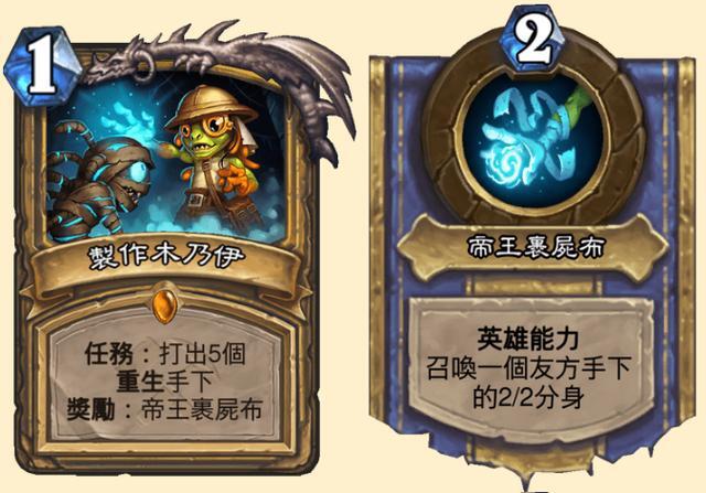 这张圣骑士的任务传说卡牌,完成条件是召唤5个带有“复生”新机制的随从,完成后可获得英雄技能“帝王裹尸布”(台湾地区译名),效果为召唤一个友方随从的2/2复制。这个任务的设计思路与萨满在安戈洛版本的任务有相似之处,当时萨满的任务要求召唤鱼人,奖励则是补充鱼人相关卡牌。
