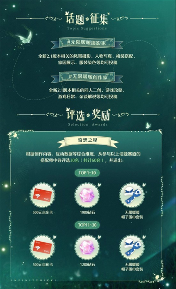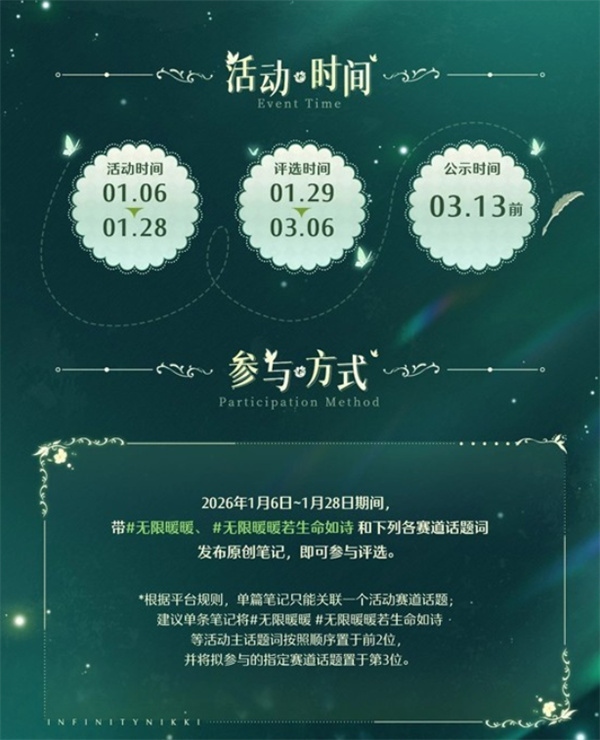 本次创作激励计划面向摄影、内容创作等领域开放。活动期间,用户在平台发布符合要求的作品,并添加 #无限暖暖 #无限暖暖若生命如诗 以及对应赛道的话题标签,即视为成功参与活动。