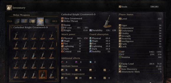 第七位:教堂骑士的大剑+9属性值
