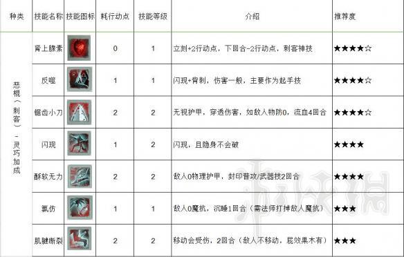 盗贼-刺客的技能伤害不算突出,因此需要搭配变化系法术,隐身配合变鸡术,通常用来收割残血或施加状态,所以才智属性不用太高,确保队伍中第二、第三顺位出手即可。先让战士打出控制效果,法师用AOE技能进行消耗,随后刺客位移到目标身边完成收割。刺客的双持技能要拉满10点,恶棍技能点到5点,这两个必须点满,这样普攻配合暴击,再加上变鸡术,敌人能瞬间失去战斗力!所以变化系2级和死灵系的吸血技能是必学的(也可以通过装备加成来实现,不用额外浪费技能点)。