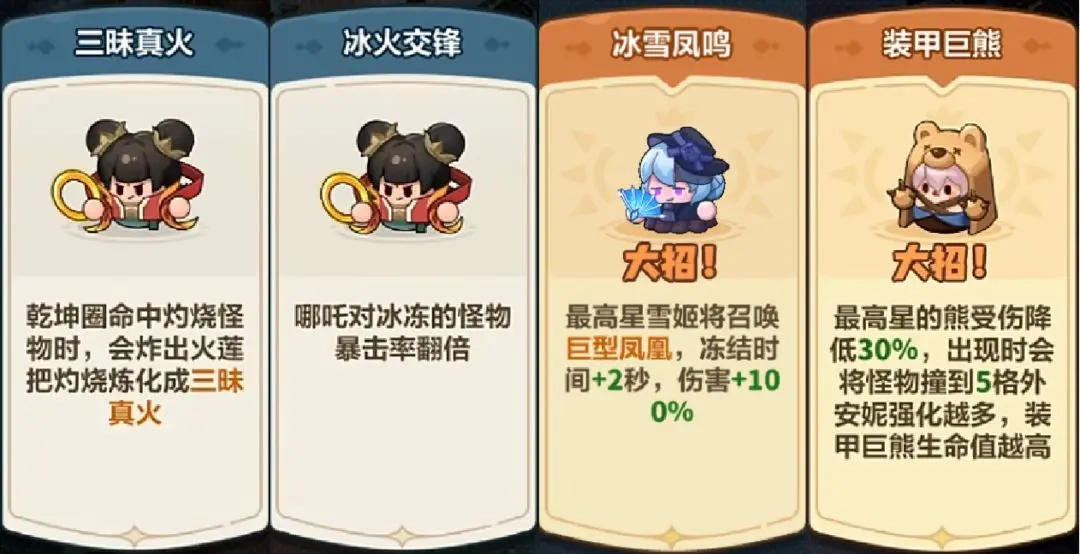 哪吒是这套阵容的核心输出点,等他升到10级解锁大招风火轮,并且一开始就拥有乾坤分化技能后,不管面对的是精英首领还是普通小怪,都能打出相当高的伤害。
