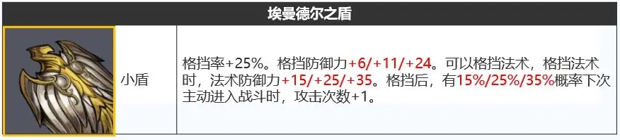 「神器效果」大多是辅助类型的,通常重点关注加一格的援护效果就行,神器升级带来的格挡防御力提升和被动增伤都属于额外的增益,核心区别在于中盾和大盾的适用场景不同——中盾在文明玩法里更容易提升积分,大盾则在盾击流派中更易冲分。