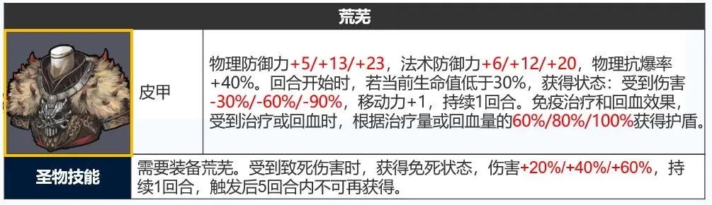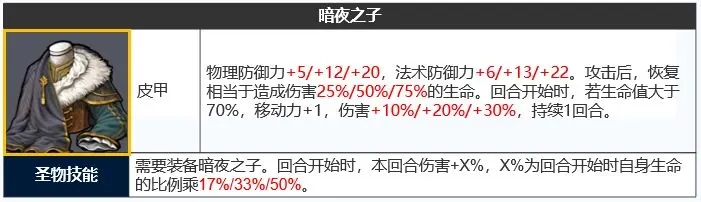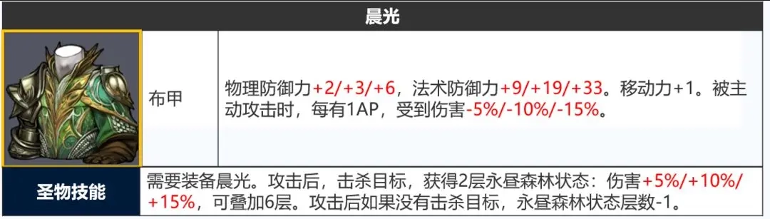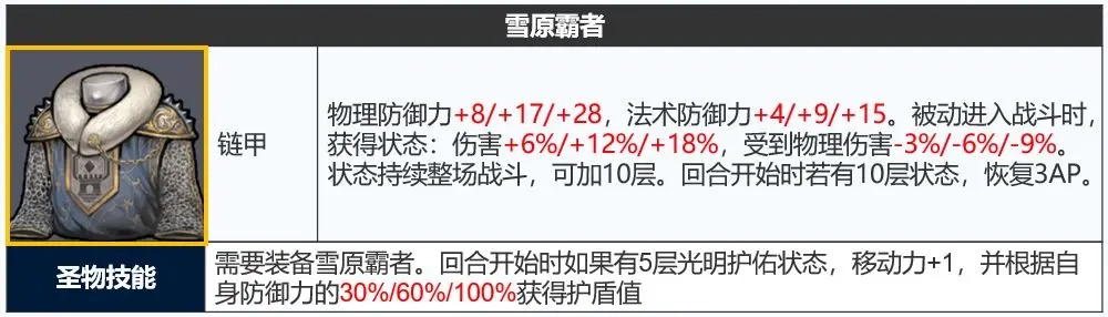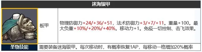 「圣物技能」纯补强,加强进攻属性,移动+1、概率回蓝让链甲可以日常屠起来更舒服,并且神鹰打塔也更容易触发蹑影追风。