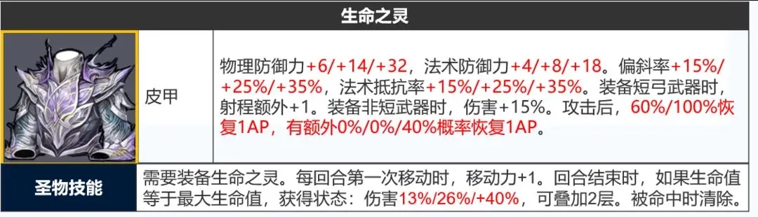 「神器效果」中规中矩,由于获得增益的条件就是需要满血触发,要么就是远程单位使用(但是生命之源更好),要么就是碾压日常的大剑士用了。