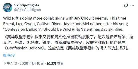 X平台上一位专注于挖掘英雄联盟相关数据与资讯的用户放出消息,透露英雄联盟手游或将与周杰伦展开新一轮合作,推出“告白气球”主题的皮肤系列。这位用户长期深耕此类信息领域,以往的爆料具备一定可信度,此次消息也让不少玩家开始了初步的猜测与讨论。