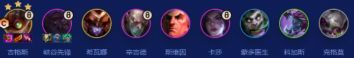 开局阶段需要凑齐2虚空羁绊作为基础,用大嘴搭配装备来完成过渡,后续随着等级提升再灵活补充祖安棋子。