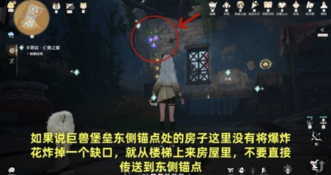 要是没探索过这个洞窟,或者虽然探索过但房屋没被爆炸花炸出缺口,那就按照指引从楼梯上去,别直接传送。