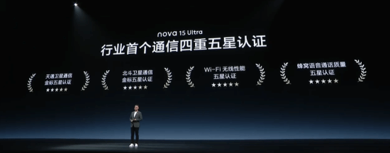nova 15 Ultra 斩获行业首个通信四重五星认证,同时达成天网通、地网通与无网通的全面覆盖,全版本均支持天通卫星通信、北斗卫星通信以及2.4GHz畅连无网通信等功能。