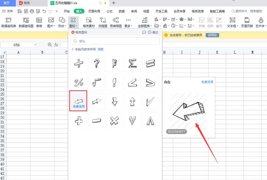 首先打开【excel表格】,接着找到并点击【插入】菜单,在其中选择【图标】工具,然后点击【免费】这一栏。