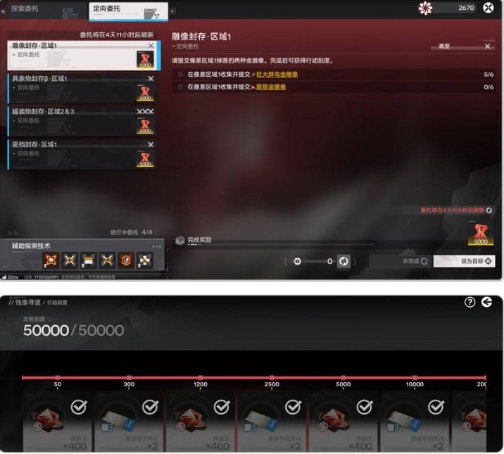 和“搜-打-撤”这类常驻玩法类似;玩家要在限定的计数(计时)条件下,对区域展开探索并推进非主线的剧情内容。进入该区域后会遭受索乱侵蚀(呈现为倒计时形式),当侵蚀状态满额时,当局的探索进程会自动结算;最终系统会依据玩家获取到的物资情况来核算对应的结算积分。