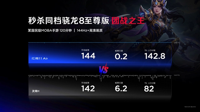 在144Hz高清画质下运行120分钟某国民级MOBA手游。红魔11 Air平均帧率为144帧,1%LOW帧为142.8帧,对比机型平均帧率为142帧,1%LOW帧为82帧。