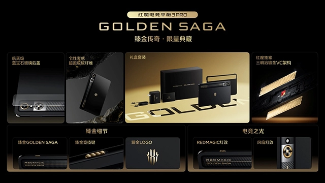 同时红魔为追求顶级电竞体验与奢华质感的玩家,也带来了红魔电竞平板3 Pro 臻金传奇。机身材质同样融合了碳纤维材质与航天级蓝宝石玻璃后盖。机身内部采用镀金VC散热模块,灯效、LOGO、竞技键等都进行了细节处理,让平板也能拥有臻金质感。